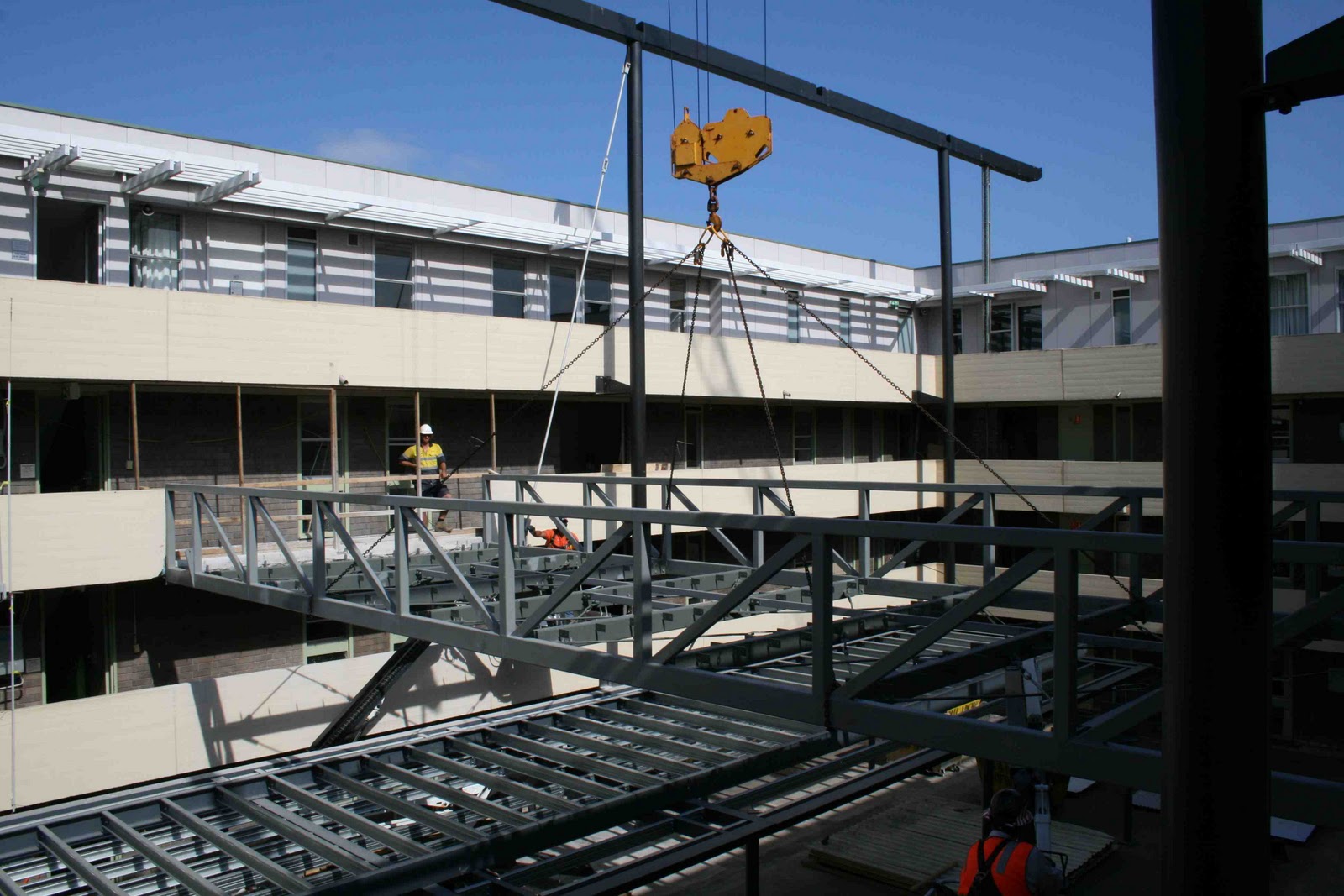 Today was a big day on site as the 3rd floor bridge was installed. Perhaps one day we'll see the memorial 'Skybridge' but this bridge will be of great use too! It will be more than just a shortcut; it will be a large space where residents can sit, read, study, paint, do projects and just hang out in the winter sun.